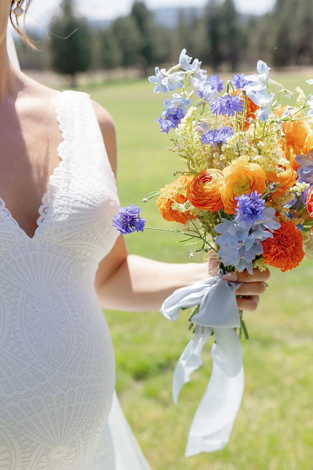 A person holding a bouquet of white flowers outdoors with snow-capped mountains in the background in Bend, Oregon.