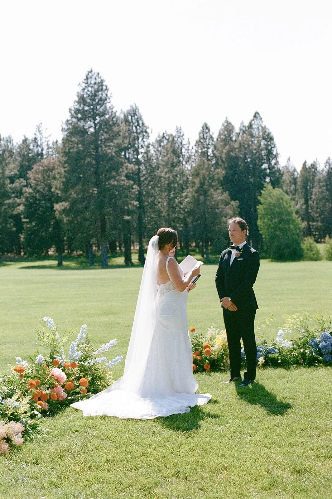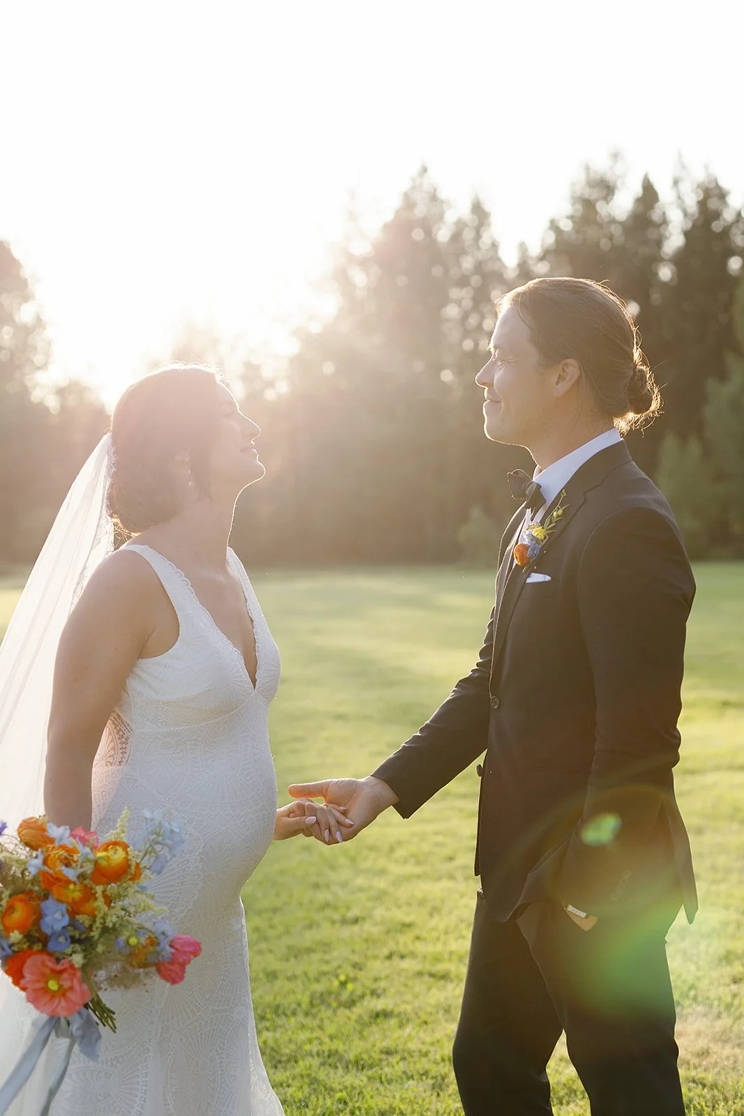 Close-up of a bride and groom holding hands outdoors, the bride in a white wedding dress holding a bouquet of white and yellow flowers, with water and grass in the background in Bend, Oregon.
