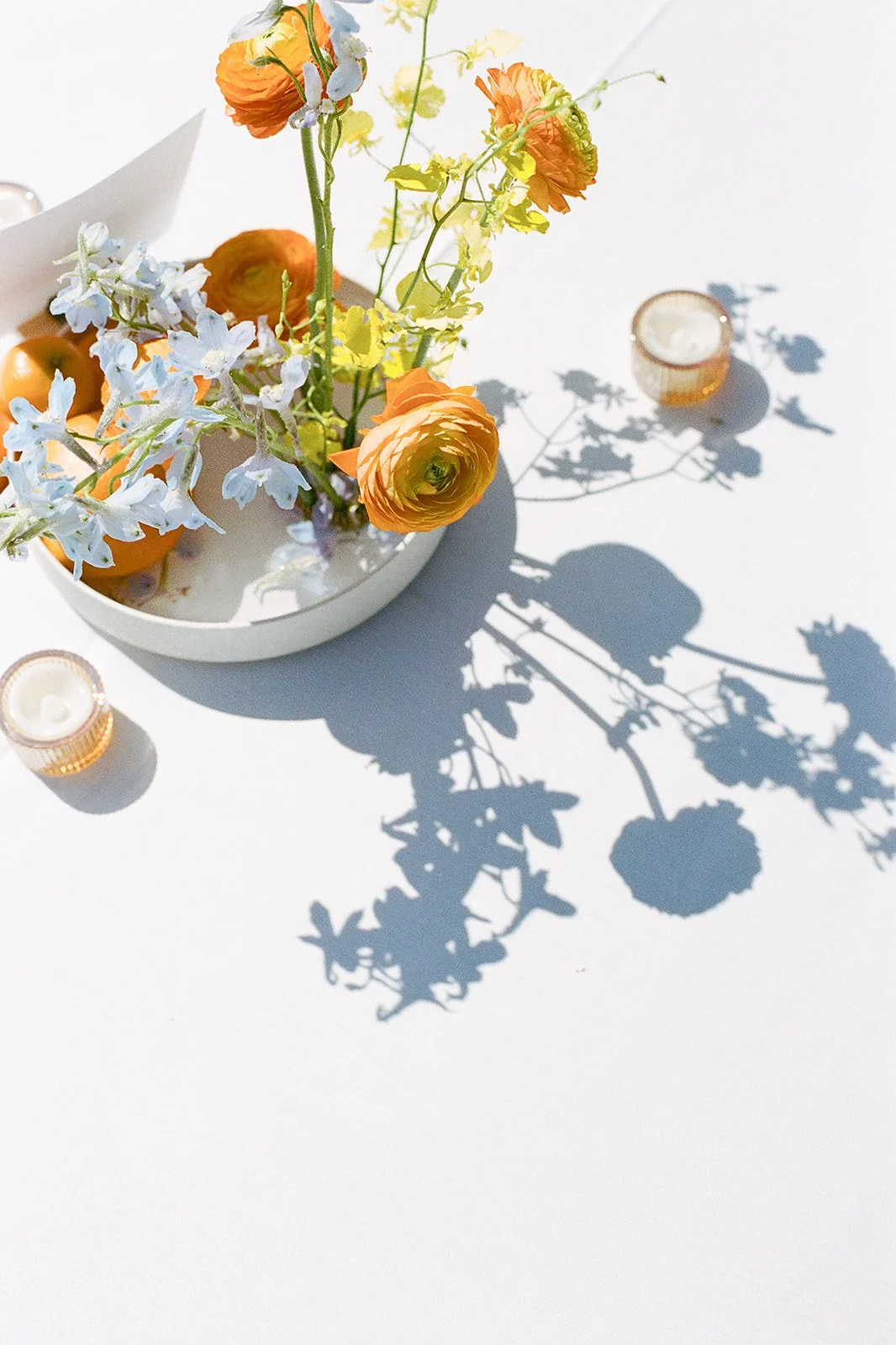 A table setting with a floral centerpiece of white flowers in a white bowl at Ariana Restaurant in Bend, Oregon